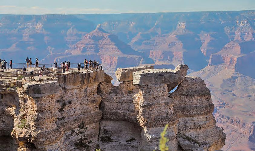 大峽谷之「大」不僅體現在其物理空間的遼 闊,更是那將上億年的地質變遷剖析於眼前的震 撼,還有那一層層化石中展現的生命留痕,以及 至今在學術界未有定論的種種不解之謎——大峽 谷形成於甚麼時候?是甚麼樣的力量形塑了這一 世界奇觀?岩層間那上億年的斷層是因何而成? 消失的部份去了哪裏⋯⋯ 穿越美國西部碩大的仙人掌群,以及那一望 無際的沙石景觀,深沉而濃烈的紅色峽谷映入眼 簾。站在觀景台,向下看到的是一千多米的垂直 高差,以及視野範圍內一望無際的峽谷峭壁,人 在這廣闊的天地間顯得渺小而微不足道。