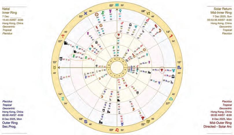 本文以一位於 12 月 7 日出生者的星盤為 例,推算其來年的運勢。今次共有三種預測技 巧,由內至外依次為:(甲)本命盤(Natal)、 (乙)太陽回歸盤(Solar Return)、(丙)太陽弧 推運盤(Solar Arc Directed)、(丁)二次推運盤 (Secondary Progression)。讀者如欲了解相關技 術,可參考〈名人星盤:葉劉淑儀可以連任嗎?〉 三篇文章中的基礎介紹。