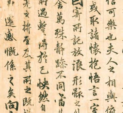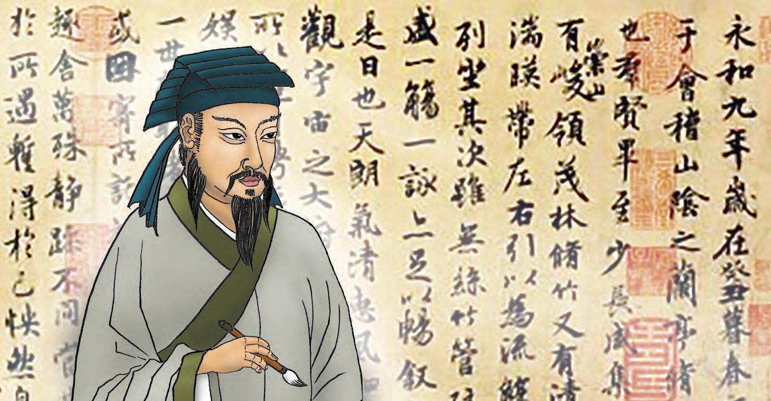 《蘭亭序》是王羲之書法作品中最為傑出的代 表。永和九年,暮春三月,正是上巳之日,王羲 之與好友謝安、孫綽、支道林等 41 位當地名士 齊聚山陰蘭亭,舉行「修禊」之會。眾人曲水流 觴,飲酒賦詩,各抒情懷,彙為《禊帖》,並公 推王羲之為此詩集作序。