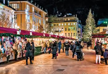 滿了手工藝品、節日裝飾品和在地美食。 市集完美地融合了阿爾卑斯山和意大利的 傳統——一會兒飄蕩著德國聖誕頌歌,一 會兒又響起意大利詠嘆調,蘋果餡餅的 香氣與新鮮沖泡的意式濃縮咖啡的芬芳 交織在一起。不妨也嚐嚐蒂羅爾熏火腿 (Tyrolean speck)和馬鈴薯丸子(Knodel)。