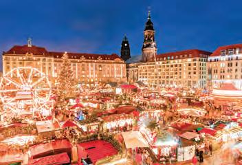 德累斯頓(Dresden)的聖誕市集早 於 1434 年即已存在,歷史最古老。地點 在阿爾特馬克特廣場(Altmarkt),以高達 14 米的聖誕金字塔和聖誕麵包節(Stollen Festival)而廣為人知。引人注目的巴洛 克式建築、燭光搖曳的唱詩班、空氣中瀰 漫的烤堅果和薑餅的誘人香氣,營造出迷 人的節日氛圍。特色飲食包括德累斯頓 標誌性的水果餡聖誕麵包、普爾尼茨薑 餅(Pulsnitzer Lebkuchen)、火焰熱紅酒 (Feuerzangenbowle,一種加入朗姆酒並點 燃的飲品)。