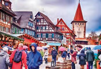 德國格根巴赫 11 月 29 日∼ 1 月 6 日 格根巴赫(Gegenbach)擁有世界上 最大的聖誕倒計時日曆,為遊客帶來獨一 無二的聖誕體驗。每天晚上,市政廳外牆 上的日曆窗口都會亮起,呈現出精美的插 圖,將整座建築變成一本栩栩如生的童話 故事書。雖然聖誕市集本身規模不大,但 其魅力卻足以彌補。攤位上出售黑森林火 腿、傳統薑餅等當地特色美食,以及手工 禮品和熱紅酒。◇