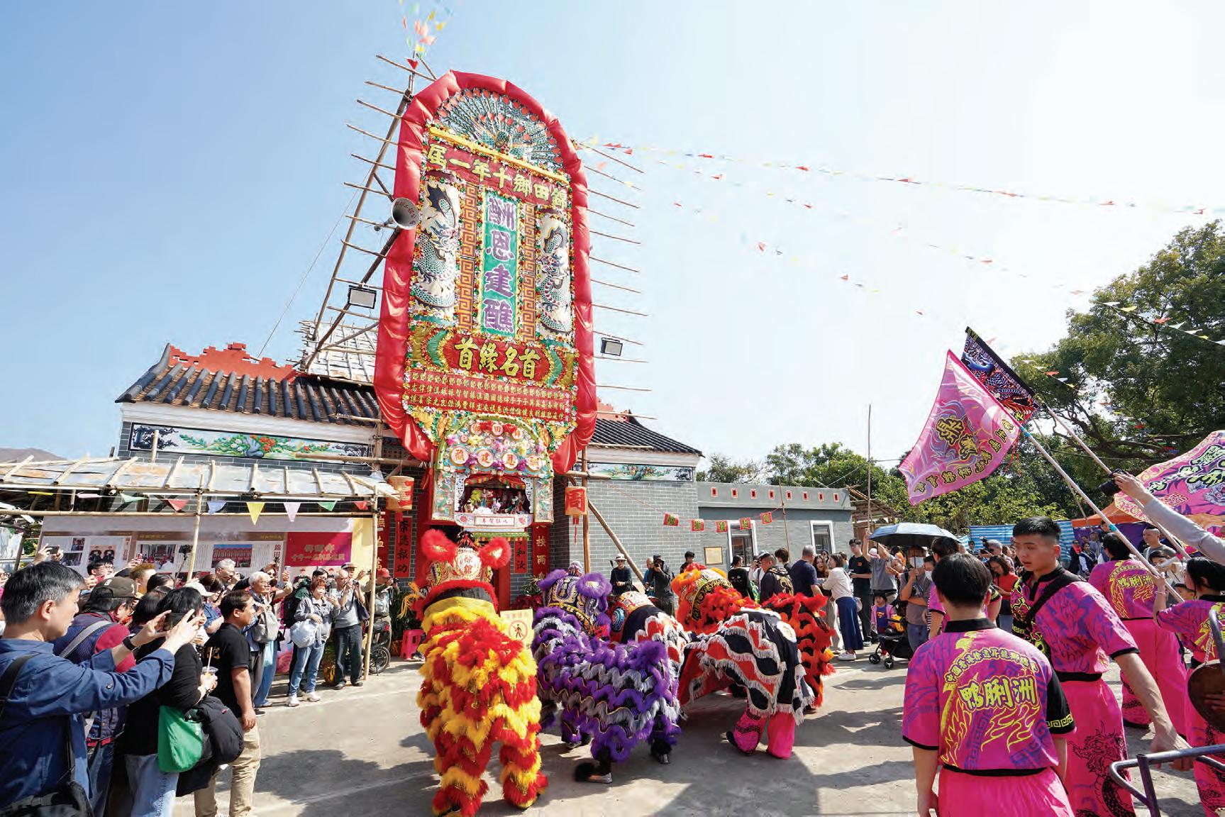 獅王爭霸賽 17 日中午在錦田鄉酬恩建醮大戲 棚上演,由來自粵港澳三地共 28 支龍獅隊以高樁 采青、靈活套路競逐「錦田獅王」殊榮,賽後更 有醒獅巡場與市民互動送福,增添喜慶氛圍。