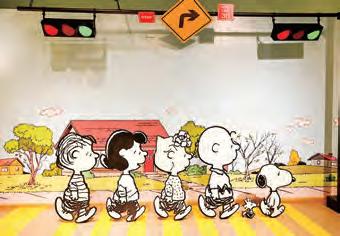 室內多數是 2D 平面畫作,有黑白 有彩色,內容幽默逗趣。畫中的史努 比穿搭百變,化身為飛行員、船長、 偵探、舞蹈家、大盜、老頭兒、戴黑