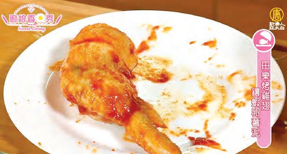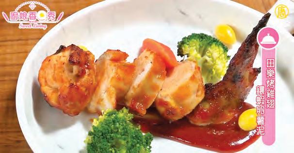 喜愛為家人做菜的主廚蔡旻翰,分享 「田樂烤雞翼鑲魚子薯泥」的製作方 法。蔡旻翰首先用廚房專用的剪刀,細 心去除三節雞翼的二節骨頭。然後將馬 鈴薯去皮切薄塊,這樣蒸的時候較快 熟。蔡旻翰也提醒,製作田樂醬時一定 要隔水加熱,攪拌至糖溶解。