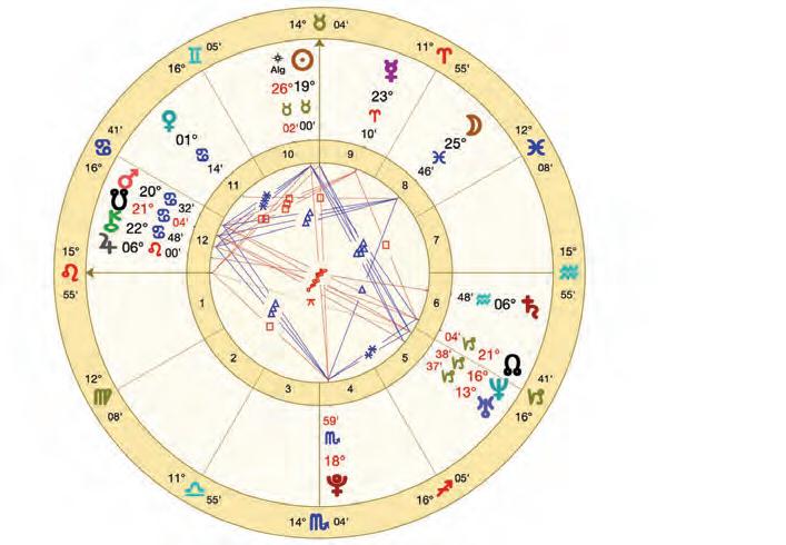 這位名人,日常喜歡打扮成牧師,但坊間更 多的是對其人格、操守及誠信的各種批評與傳 聞。究竟從他的星盤之中,有哪些地方值得注 意?星盤又是否能預先告知他是好人還是壞人? 由於並沒有其確實出生時間,因此分析時只需留 意行星及相位(即圖中的顏色線)。