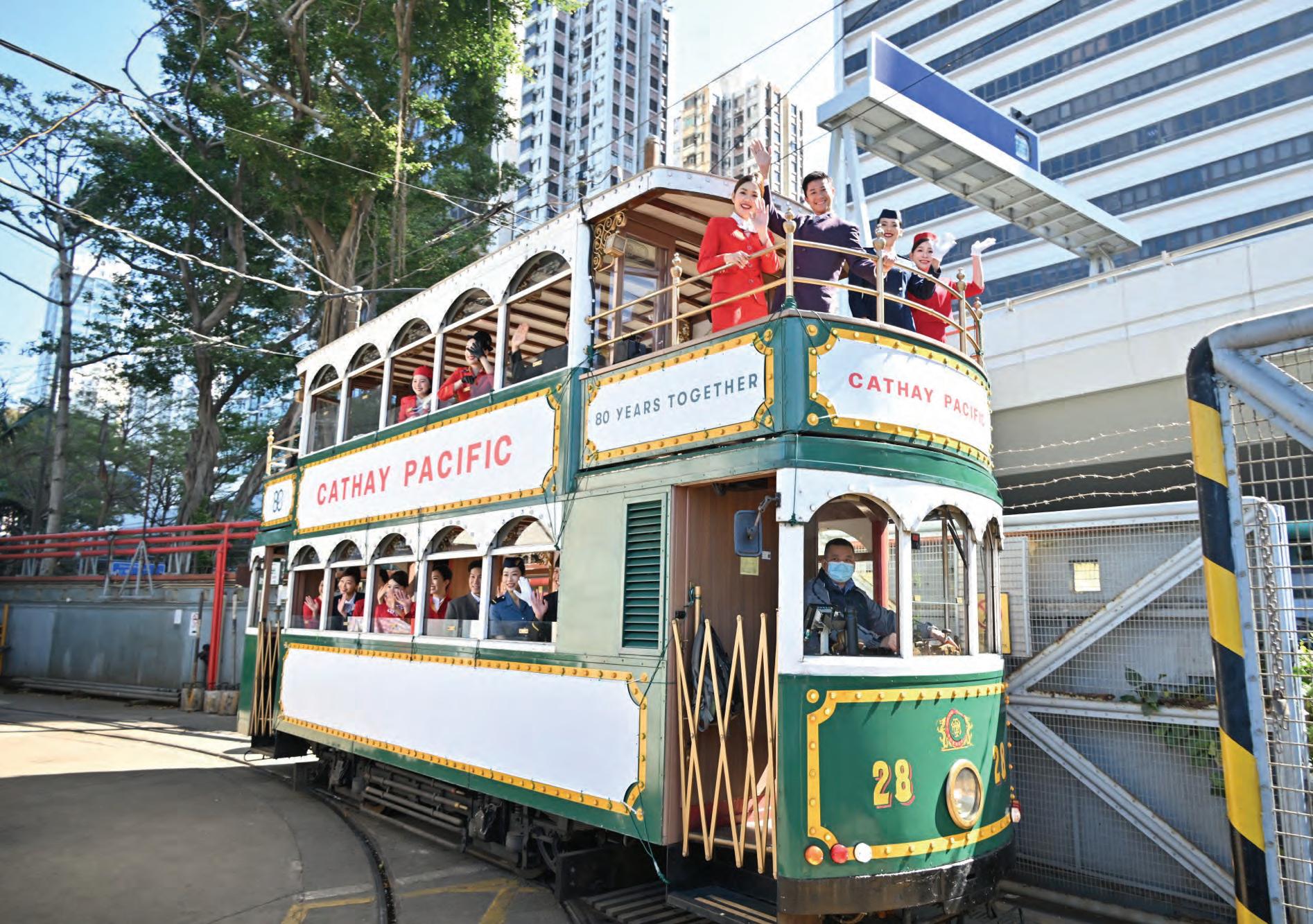 國泰航空慶祝成立 80 周年,25 日下午舉 辦主題電車巡遊,沿屈地街電車廠駛至 北角。前線員工今年亦會穿上歷代經典 懷舊制服執勤。