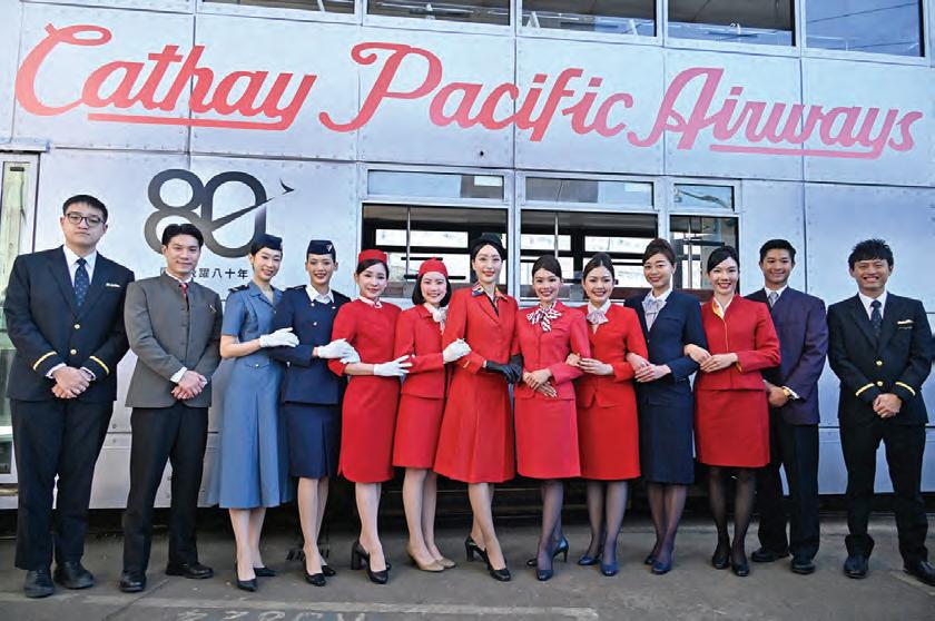 國泰逾 2,000 名地勤及機艙服務員,會穿上國 泰自 1946 年以來十款別具代表性的經典制服,包 括最初在 40 年代戰後受軍事風格影響的藍色制服; 1960 年代以中式鈕扣和紅色 A 字短裙配圓帽等。