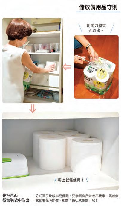 先把東西從包裝袋中取出,分成單份比較容 易儲藏,要拿到廁所時也不費事。既然終究都要 花時間做,那麼「最初就先做」吧! 廁所衛生紙也一樣。大家很容易一買回來就