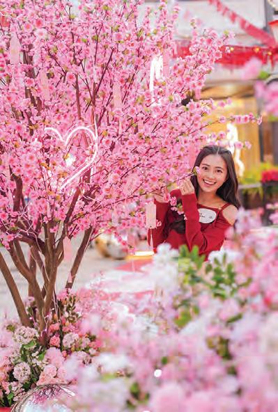 場內戶外空間以盛開桃花與飛舞花瓣布置 一條貫穿全場的「桃花迎春步道」,取「步步生 花、一路繁華」。