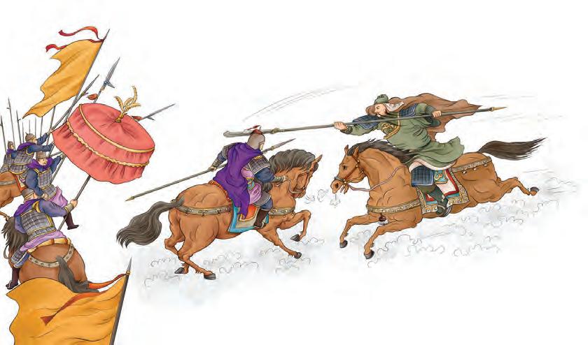 顏良見到曹操奇兵,大驚之下倉促應戰。關 羽擒賊先擒王,遙遙望見顏良的旗幟和車蓋,策 馬飛馳到顏良面前,手起刀落斬下顏良頭顱,隨 即調轉馬頭重回本陣。