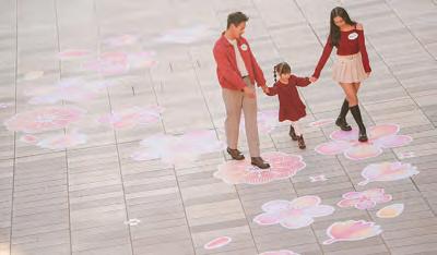 二樓晴空花園則化身「寵愛花見陣」,其中 2.8 米高桃花樹掛滿心型霓虹燈和寫滿馬年願望 的祈福掛飾,象徵「花開富貴、心心相印」。 一旁的 2.9 米闊立體桃花「Love」裝置,盛載著