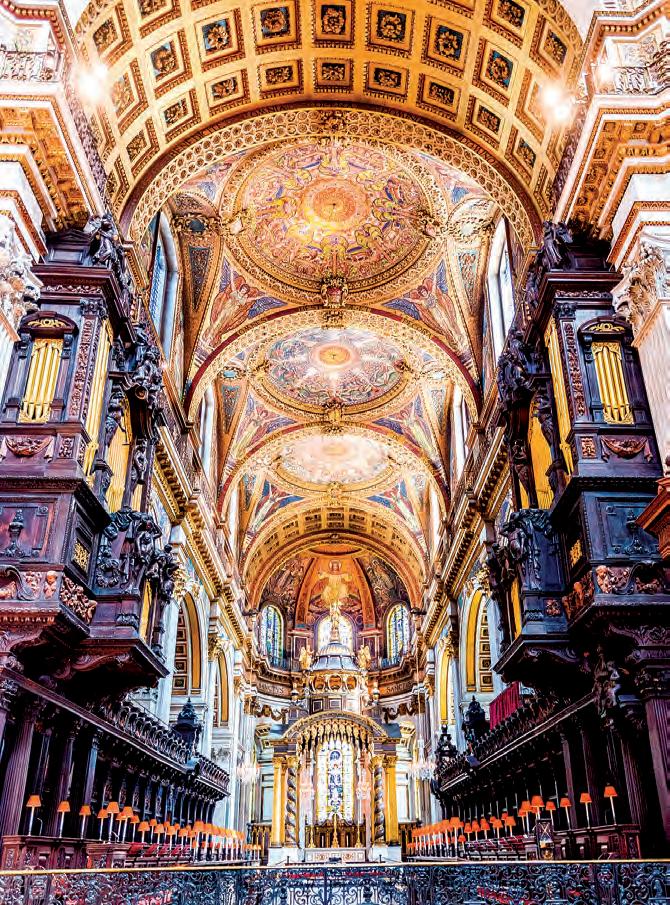 中殿兩側有科林斯式壁柱支撐的側道拱廊隔開。雷恩精心設計的拱頂包括碟形圓頂,以 及環繞著檐窗的弦月造形的拱覆。拱頂有馬賽克藝術,從中殿一路通往挑高的祭壇。 (Shutterstock)