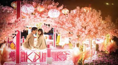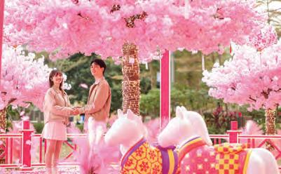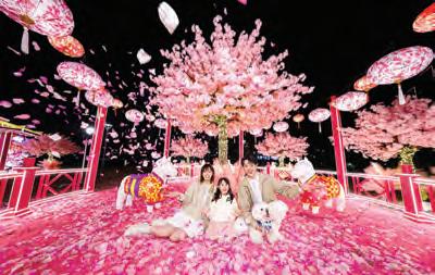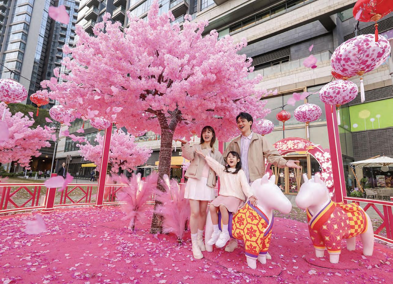 「花舞庭園」中央矗立一株絢爛綻放的巨型櫻花樹,在微 風輕拂之下,落櫻如雨翩然起舞,寓意福澤綿延、美夢 成真。