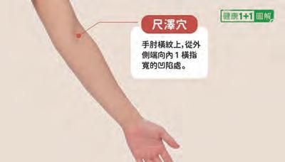 尺澤穴位於手肘橫紋靠近大拇指的一側。按 壓時,用另一隻手指輕壓尺澤穴,配合肩膀與頸 部的輕微晃動,就能促進氣血流通。