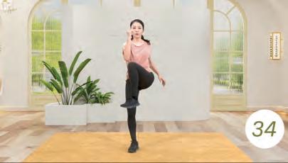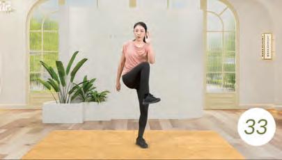 採站立姿勢,雙腳與肩同寬,身體重心移向 左側,抬起左手。左手向下划動,同時右腳膝蓋 朝左側手肘方向抬起,至大腿與地面平行後放 下。
