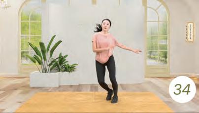 採站立姿勢,雙腳與肩同寬,身體重心移向 右側並抬起右手。右臂屈肘向下划動時,同步抬 起左膝,讓右肘碰觸左膝後回到起始位置;接著 右臂伸直向下划動,同時左腳直膝抬起,右手碰 觸左腳後再回到起始姿勢。右臂以屈肘與直臂動 作交替進行,過程中右腳隨節奏在原地輕跳。