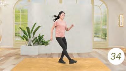 採站立姿勢,雙腳與肩同寬,身體重心移向 左側並抬起左手。左臂屈肘向下划動時,同步抬 起右膝,讓左肘碰觸右膝後回到起始位置;接著 左臂伸直向下划動,同時右腳直膝抬起,左手碰 觸右腳後再回到起始姿勢。左臂以屈肘與直臂動 作交替進行,過程中左腳隨節奏在原地輕跳。