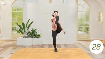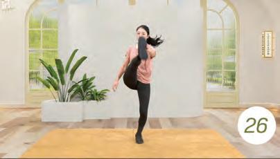 採站立姿勢,雙腳與肩同寬,身體重心移向 右側,抬起右手。右手向下划動,同時左腳膝蓋 朝右側手肘方向抬起,至大腿與地面平行後放 下。