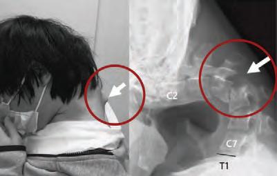 一名年僅 25 歲的年輕男子,因長時間低 頭玩手機,最終連頭都抬不起來。他的 下巴幾乎貼在胸口,脖子後方還長出一 塊明顯突起的骨頭,成為極為罕見且嚴 重的「垂頭症」病例。這名患者的頸椎 結構已出現嚴重變形,第 4、第 5 節椎間 關節被撐開到異常程度,脊椎明顯向前 彎折,導致頭部整個下垂。經過手術切 除增生的部份,患者才能重新抬頭。