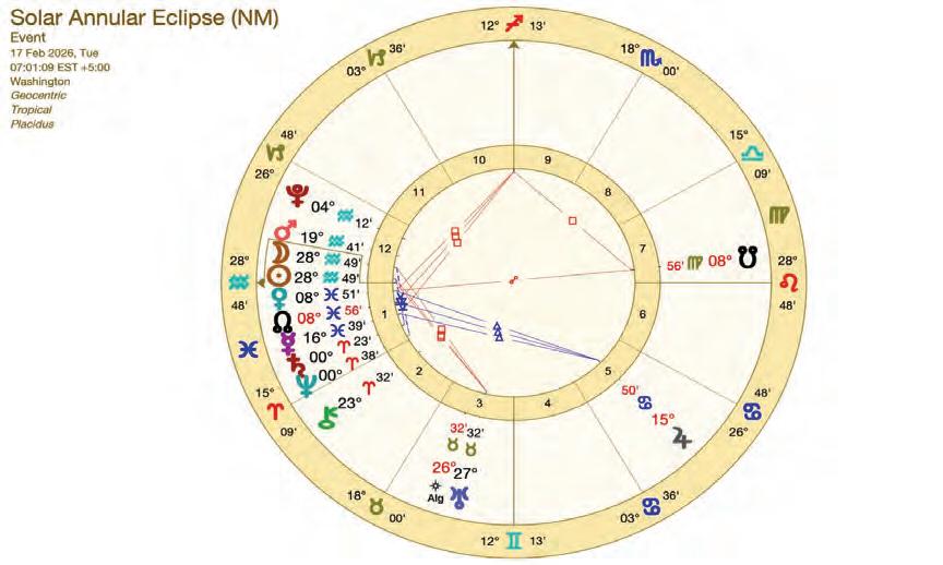 筆者偶然打開美國本次日環蝕的國運星盤, 發現太陽與月亮於水瓶座 28 度合相,並且同時 合相上升點,且全部落在第一宮。此一配置極為 罕見,意味這次日蝕不僅影響美國的外在形象, 更直接觸及其國家主體性、自我認知與未來方 向。這組星象對美國未來數年的國運具有高度指 標性,尤其與當前國內政治撕裂及外交困局形成 強烈呼應,實在值得深入分析。