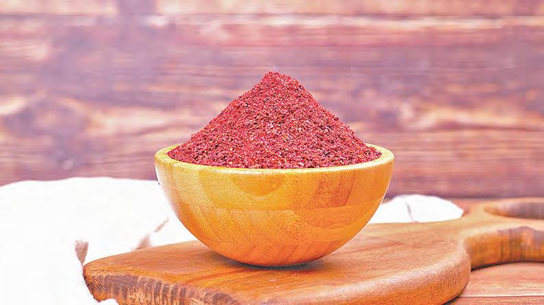 製作醬汁時,應 加入磨碎的蘇木 香料(Sumac)。