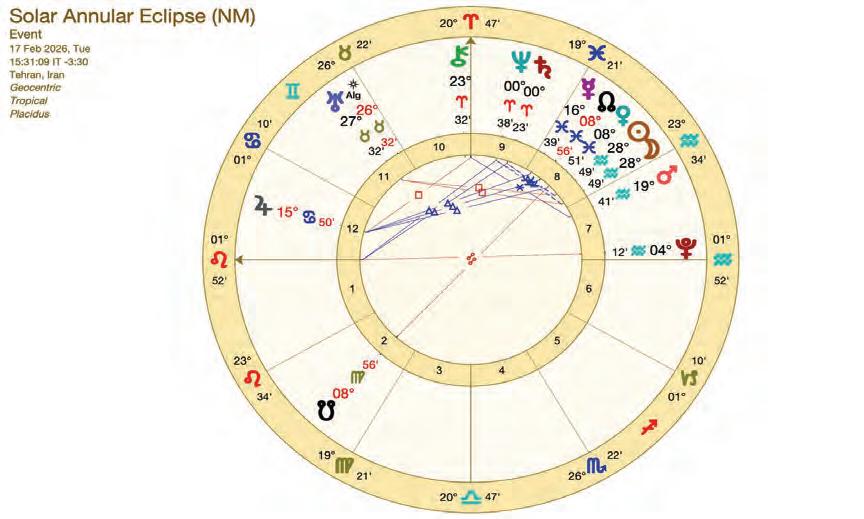 由於本次日蝕的上升星座為獅子座,而第二 宮(經濟)同樣落於獅子,其宮主星太陽在水瓶 座與月亮合相,並直接構成日環蝕結構,反覆強 調影響將集中於國家本命與財經體系之中。