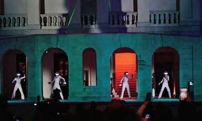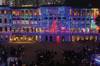 在澳洲創意及技術夥伴 The Electric Canvas 的支持下,今年「綻放大館」與 The Collective 合 作,首次引入實時互動體驗。觀眾可於檢閱廣場 踏上感應式舞磚,以不同動作與律動觸發立體光 雕投影的視覺變化。裝置可追蹤觀眾的身體動 作,實時投影到營房大樓外牆上,讓觀眾化身光 雕投影匯演的參與者,在大型舞蹈派對共同起舞。 大館藝術總監簡寧天表示,今年「綻放大館」 串連了大館多年來探索的香港流行文化脈絡,從
