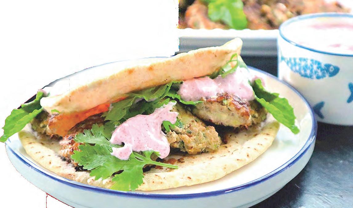用粗切的翠玉瓜替代麵包糠,既 為肉餡增添溼潤度,使肉丸口感更加 柔嫩,又起到黏合劑的作用。它還能 補充膳食纖維,卻不會帶來過多熱量。 這道菜吸引人之處在於五顏六色 的醬汁。將酸忌廉(Sour Cream)、乳 酪與檸檬汁混合,再加入磨碎的蘇木 香料(Sumac),這種辛香調料由乾燥 蘇木果(Sumac Berry)研磨而成,帶 有鮮香的檸檬風味。調製出的醬汁呈 現出迷人的紫粉色,令人聯想到棉花 糖或樹莓(覆盆子,Raspberry)雪糕。