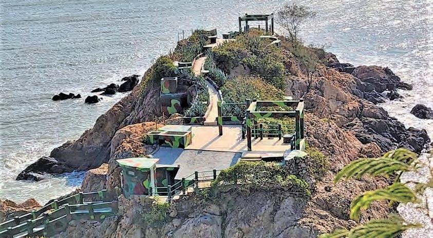 前往海岸邊的鐵堡,這是一座突出海上的獨 立岩礁,以混凝土構築的軍事設施,外觀低矮, 迷彩色的鐵堡面向海面,曾經是戰地要寨,迄今 依然低調神秘,彷彿仍在執行某種未曾解除的任 務。不過,現今的鐵堡已不再承擔防禦功能,卻 仍保留著抗戰時期的緊繃氣息。歷史在這裏不需 要解說牌,它本身就是一種沉默的存在。