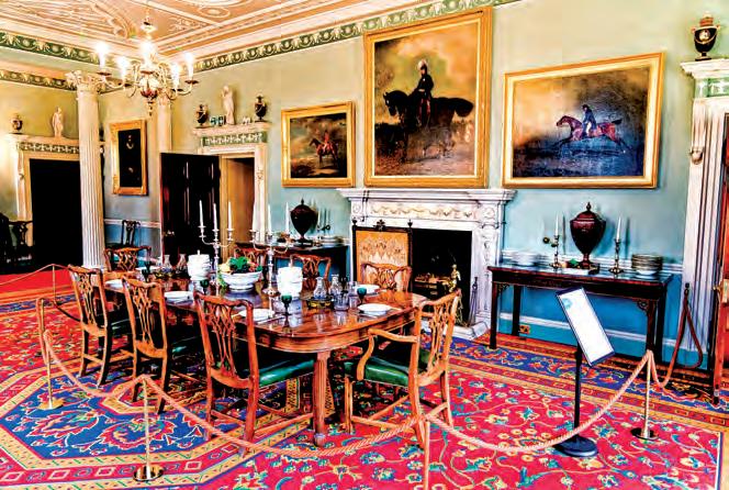 餐廳鋪有裝飾性的紅地氈、一套大木桌與椅子,以及大壁爐。牆壁漆成格魯吉亞時期典型 的柔和綠,此外還有精美的鑲板、壁柱和新古典主義的裝飾飾帶。(Shutterstock)