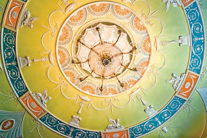 交誼廳的天花板顏色搭配房間地毯而有藍色、白色和紅色。新古典主義元素包含精緻的石 膏裝飾、水彩畫,以及細節錯綜複雜、幾何造型的飾帶。(Shutterstock)