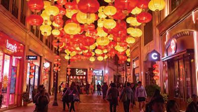 新年期間,逾 800 個金紅喜慶燈籠匯聚成華 麗燈海,照亮約 200 米長的林蔭大道,寓意鴻運 當頭、闔家團圓。中庭特別設置 12 棵近 3.5 米高 粉紅桃花樹,築成開運庭院,為情人節及元宵佳 節打造溫馨甜蜜的打卡熱點,亦寄寓情人間的幸 福甜蜜與家人間的和睦圓滿。