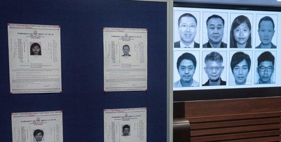 Photos of eight activists who have been issued arrest warrants over national security are displayed during a press conference in Hong Kong on July 3, 2023.