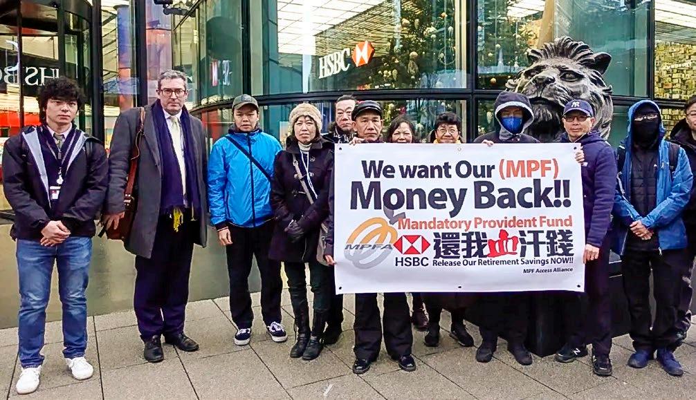 More than a dozen Hong Kong people protested outside the HSBC headquarters to protest against HSBC, one of the trustees of the Mandatory Provident Fund (MPF), for withholding substantial MPF savings belonging to overseas Hongkongers and demanded the return of the funds.