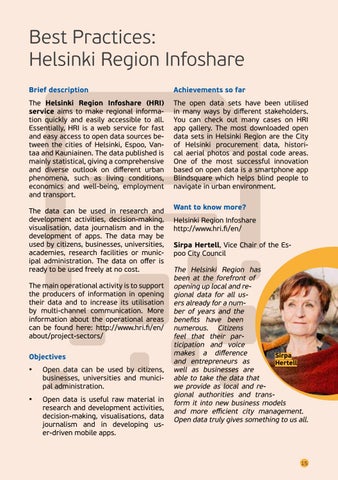 The Helsinki Region has been at the forefront of opening up local and regional data for all users already for a number of years and the benefits have been numerous. Citizens feel that their participation and voice makes a difference Sirpa and entrepreneurs as Hertell well as businesses are able to take the data that we provide as local and regional authorities and transform it into new business models and more efficient city management. Open data truly gives something to us all.