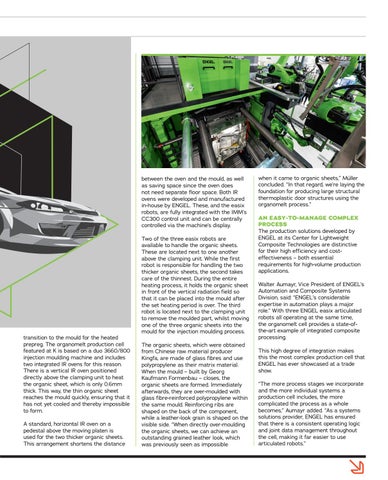when it came to organic sheets,” Müller concluded. “In that regard, we’re laying the foundation for producing large structural thermoplastic door structures using the organomelt process.” AN EASY-TO-MANAGE COMPLEX PROCESS The production solutions developed by ENGEL at its Center for Lightweight Composite Technologies are distinctive for their high efficiency and costeffectiveness – both essential requirements for high-volume production applications. Walter Aumayr, Vice President of ENGEL’s Automation and Composite Systems Division, said: “ENGEL’s considerable expertise in automation plays a major role.” With three ENGEL easix articulated robots all operating at the same time, the organomelt cell provides a state-ofthe-art example of integrated composite processing. This high degree of integration makes this the most complex production cell that ENGEL has ever showcased at a trade show. “The more process stages we incorporate and the more individual systems a production cell includes, the more complicated the process as a whole becomes,” Aumayr added. “As a systems solutions provider, ENGEL has ensured that there is a consistent operating logic and joint data management throughout the cell, making it far easier to use articulated robots.”