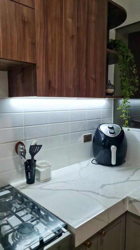 comedor de diario, el cuál fue reemplazada por una mesa auxiliar pequeña perfecta como desayunador para dos o tres personas. El espacio en el que antes se ubicaba el comedro de diario se ubicó la refrigeradora y una vitrina traslucida con espacio para libre como estación de café que se puede observar desde el comedor. El estilo y los detalles siguen el moobboard cálido y moderno pero con un aire clásico. La propuesta se contempla en dos etapas.