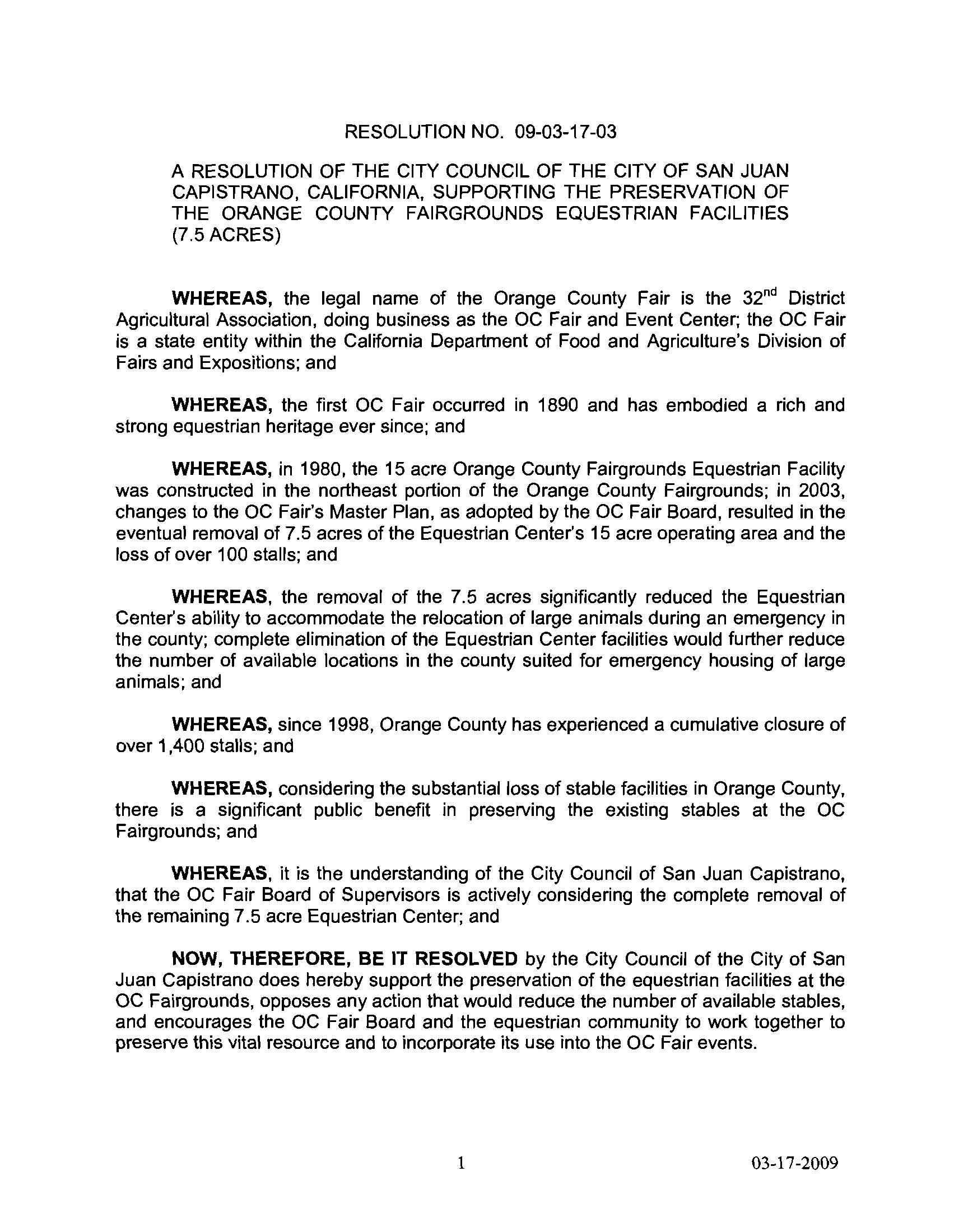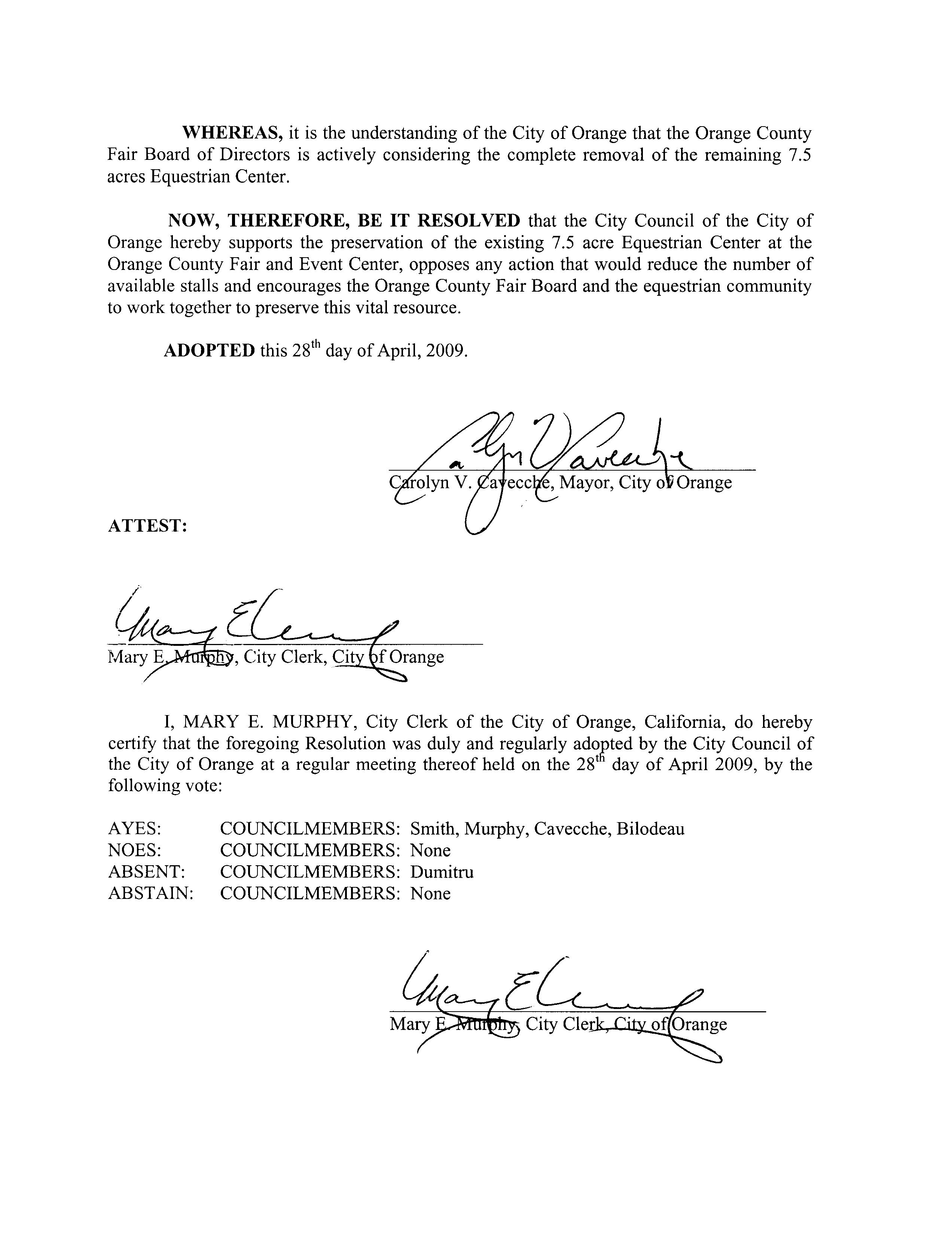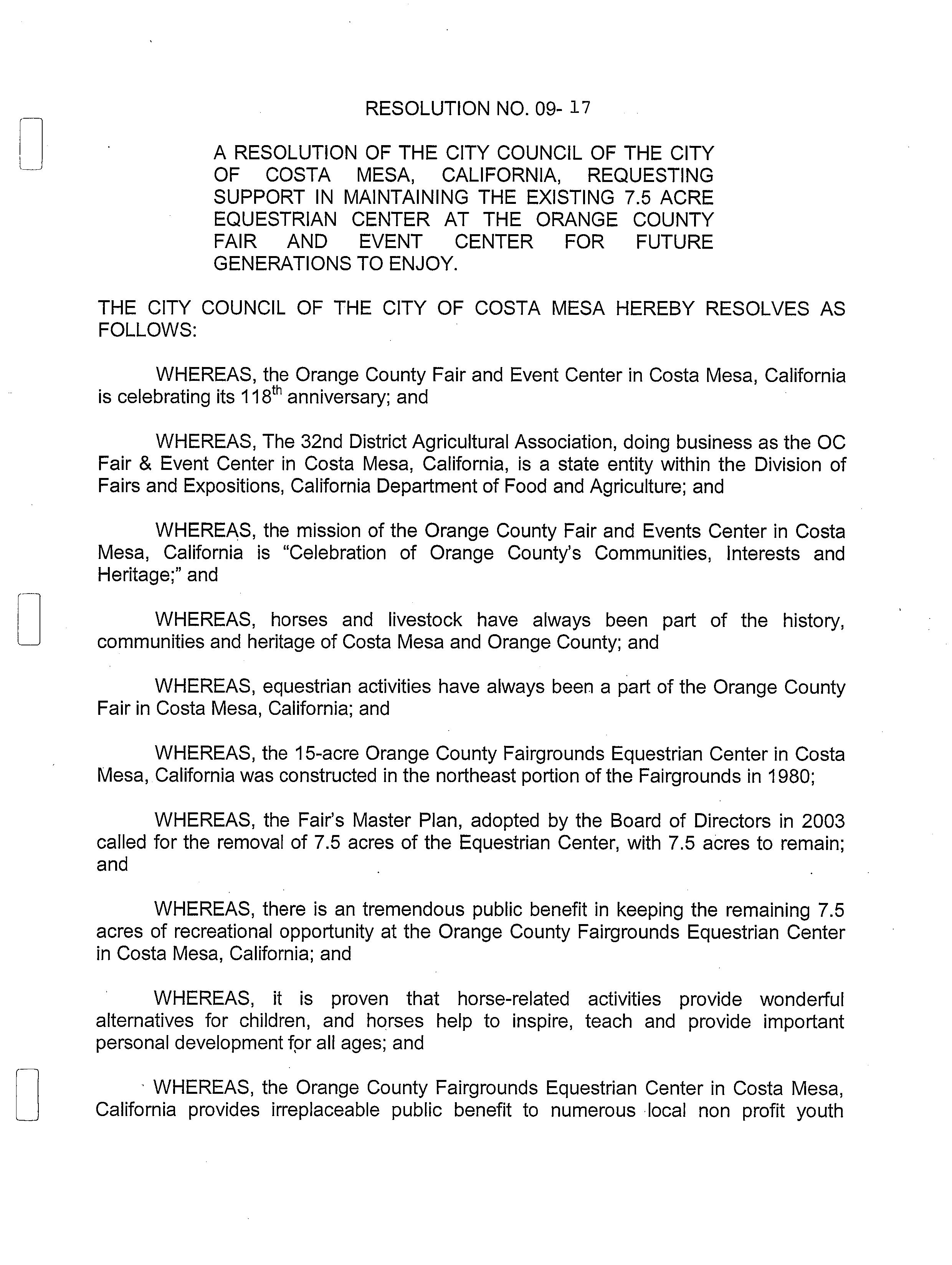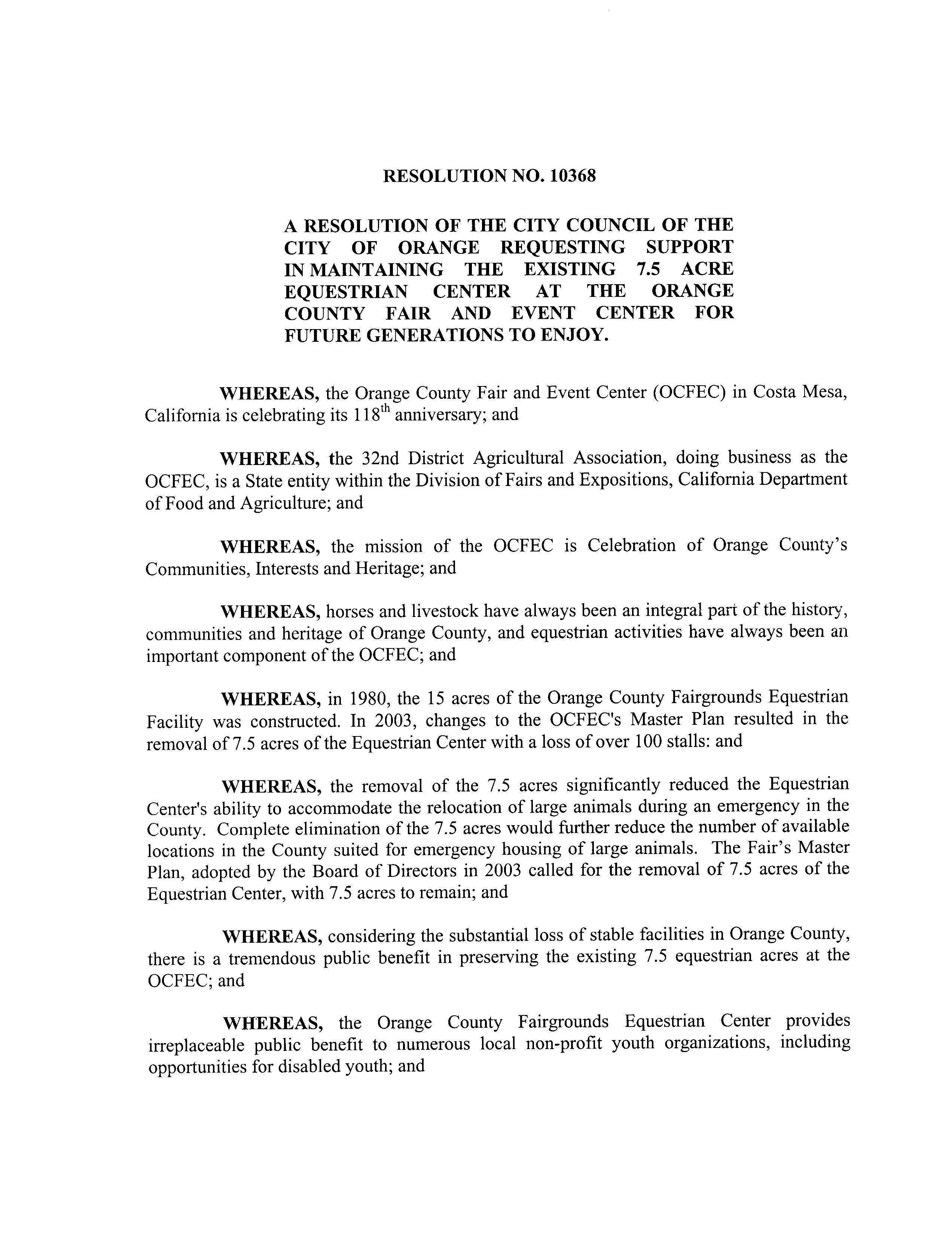 NOW THEREFORE BE IT RESOLVED that the City Council of the City of Orange hereby supports the preservation of the existing 7 5 acre Equestrian Center at the Orange County Fair and Event Center opposes any action that would reduce the number of available stalls and encourages the Orange County Fair Board and the equestrian community to work together to preserve this vital resource