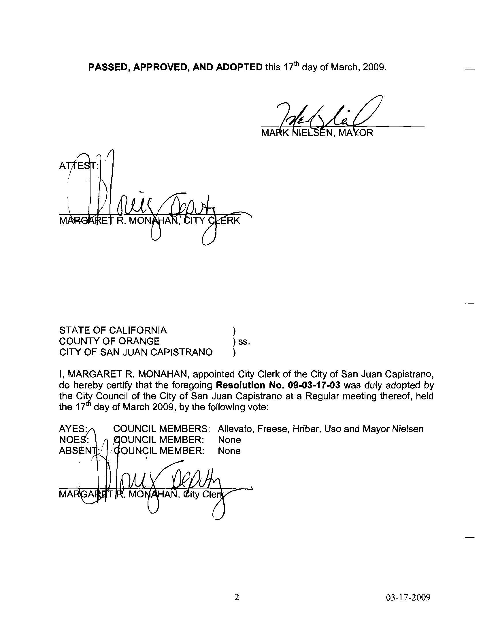 I MARY E MURPHY City Clerk of the City of Orange California do hereby certify that the foregoing Resolution was duly and regularly adopted by the City Council of the City of Orange at a regular meeting thereof held on the 28t day of April 2009 by the following vote