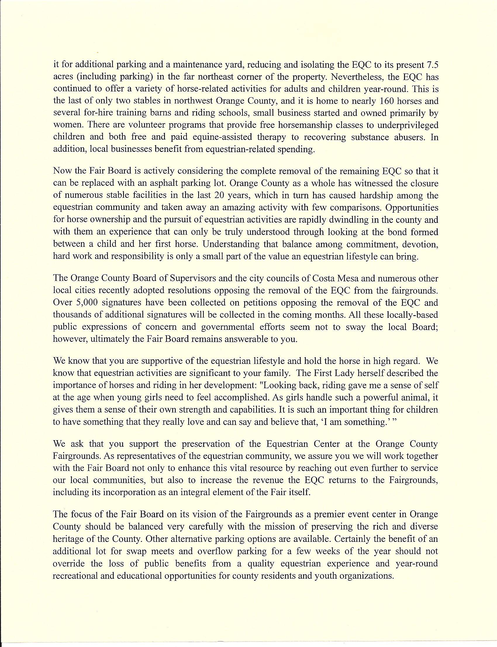 WHEREAS in 1980 the 15 acres of the Orange County Fairgrounds Equestrian Facility was constructed In 2003 changes to the OCFEC s Master Plan resulted in the removal of7 5 acres of the Equestrian Center with a loss of over 100 stalls and