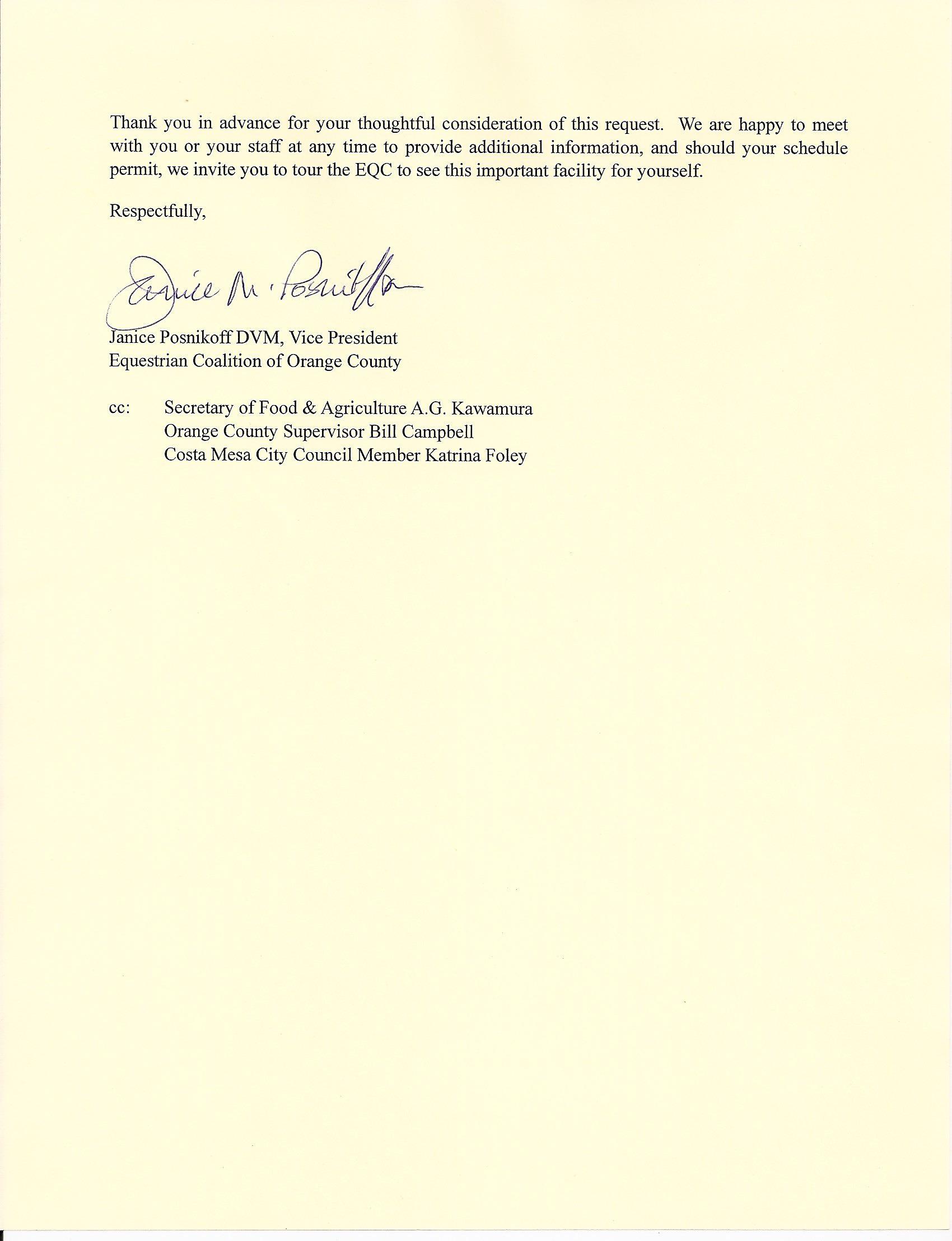 Dear Ms. Vandermost,Thank you for taking the time to allow public comment on January 22, 2009 concerning the Equestrian Center at the fair grounds.