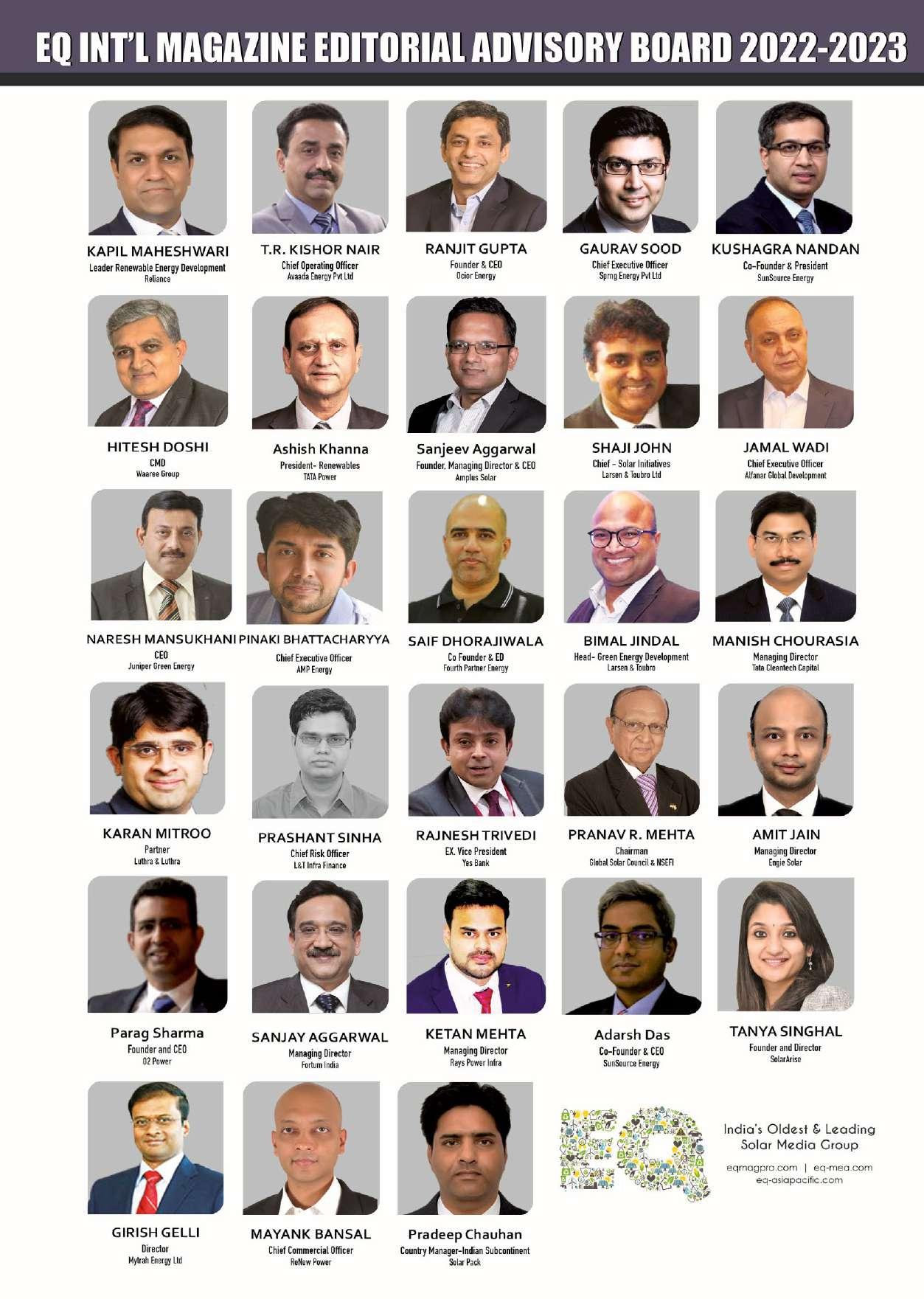 74 EQ DECEMBER 2022 ADVERTISERS INDEX SUBSCRIBE Subscribe “EQ International” at www.EQMagPro.com or fill your complete address and Email to :admin@gmail.com or Call +91-7692973898 Yes! I would like to Subscribe to EQ International Magazine For 1 Issue: o Indian citizens Rs. 200 o International $ 25 / € 20 For 1 Year (12 issues): o Indian citizens Rs. 2400 o International $ 300 / € 240 Please Mail the coupon to: Name: Job Title: Department: Company: Description of the Company: Adress: City/State/Zip Code: Country: Phone: Fax: E-Mail. Web site: PAYMENT 1.- My Cheque/DD in favour of “FirstSource Energy India Private Limited” for Rs…………………………………………………………………… Drawn on………………………………………is enclosed herewith. Date/Signature: 2.- I will pay by Credit Card Type: .......................................................................... Name on Card: Number: Security Code: Expiration Date: Mail this coup on to: First Source Energy India Pvt. Ltd. Subscription Department. 95 C, Sampat Farms, Bicholi Mardana Distt-Indore 452016 Tel. + 91 96441 22268 " GAUTAM SOLAR........................................................FRONT COVER INSOLATION....................................................................................13 JA SOLAR....................................................................BACK COVER RENEW-X.........................................................................................71 RISEN....................................................INSIDE FRONT COVER LHS SAATVIK.........................................................................................07 SOFAR SOLAR.....................................INSIDE FRONT COVER RHS TBEA................................................................INSIDE BACK COVER
