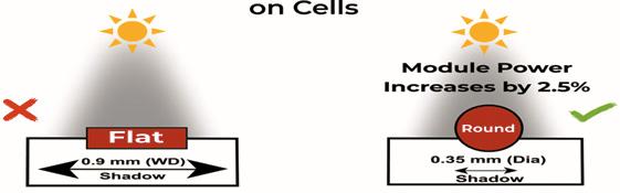 This leads to about 75% lower shading on cells and up to 2.5% power increase as compared with cells using flat ribbon.