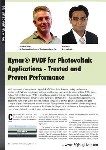 Kynar® PVDF for Photovoltaic Applications - Trusted and Proven Performance With the advent of new patented Kynar® PVDF films from Arkema, the key performance attributes of PVF can be achieved and improved in many cases with the use of a Kynar® film layer. Polyvinylidene fluoride, or PVDF is a highly non-reactive and pure thermoplastic fluoropolymer with repeating vinylidene difluoride units as follows –(CH2CF2)n–. Thus it contains approximately double the number of carbon-fluorine bonds as compared with PVF polymer. It is the high bond strength of the carbon-fluorine bond that makes fluoropolymers unique in terms of their long-lasting performance and chemical resistance. To achieve the longest term performance, fluoropolymers as a class of materials will provide trusted and proven long term protection.