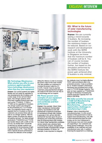 EQ: What is the future of solar manufacturing technologies Kramer: We are currently seeing a trend towards 5 busbars. By increasing the number of busbars the resistance losses can be reduced. Based on our research and development work with the SERIS Institute at the University in Singapore we know that the maximum number of busbars will be 6. You can of course increase the number of busbars further, but based on the simulation performed by the SERIS Institute the power gain achieved after 6 busbars is only minimal. EQ: Technology Obsolesence : What solution you offer to your customers against possible future technology obsolescence when they buy your equipment Kramer: Our current systems are highly flexible and can easily be upgraded to new developments like 6 busbars and a wide range of new cell and ribbon types. Also stringer systems which have been supplied several years ago, such as the TT1200HS, TT1600 or TT1800 can be upgraded to 5 busbars. The stringer system was designed for the processing of 2, 3 or 4 busbar cells. Our engineers found a way to upgrade them to 5 busbars so that our customers can process these cells as well on our stringer systems. With the higher number of busbars the ribbons are getting narrower. Our latest stringer generations TT4200GIGA and TT2100 can handle ribbons with a width of only 0,6 mm. As another item I would like to add that our stringer systems can be upgraded for the processing of light trapping ribbons (LTR). These ribbons have a special structure embossed to increase the reflection of the sunlight