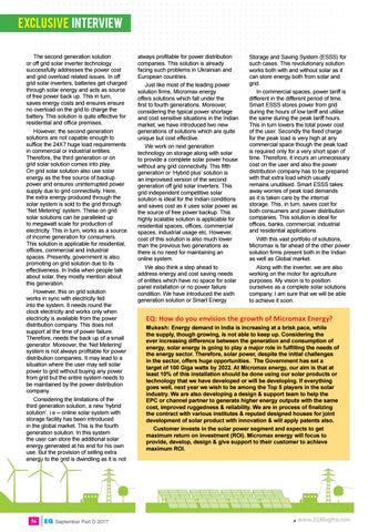 Storage and Saving System (ESSS) for such cases. This revolutionary solution works both with and without solar as it can store energy both from solar and grid. In commercial spaces, power tariff is different in the different period of time. Smart ESSS stores power from grid during the hours of low tariff and utilise the same during the peak tariff hours. This in turn lowers the total power cost of the user. Secondly the fixed charge for the peak load is very high at any commercial space though the peak load is required only for a very short span of time. Therefore, it incurs an unnecessary cost on the user and also the power distribution company has to be prepared with that extra load which usually remains unutilised. Smart ESSS takes away worries of peak load demands as it is taken care by the internal storage. This, in turn, saves cost for both consumers and power distribution companies. This solution is ideal for offices, banks, commercial, industrial and residential applications. With this vast portfolio of solutions, Micromax is far ahead of the other power solution firms present both in the Indian as well as Global market. Along with the inverter, we are also working on the motor for agriculture purposes. My vision is to position ourselves as a complete solar solutions company. I am sure that we will be able to achieve it soon.