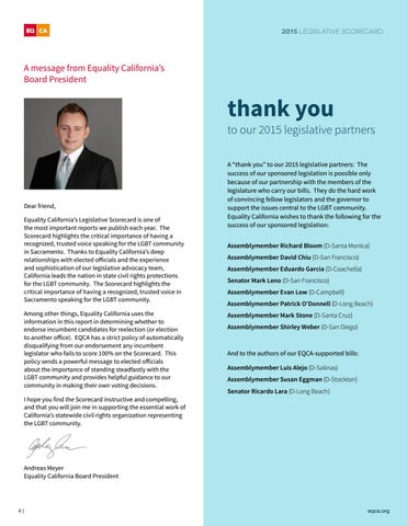 And to the authors of our EQCA-supported bills: Assemblymember Luis Alejo (D-Salinas) Assemblymember Susan Eggman (D-Stockton) Senator Ricardo Lara (D-Long Beach)