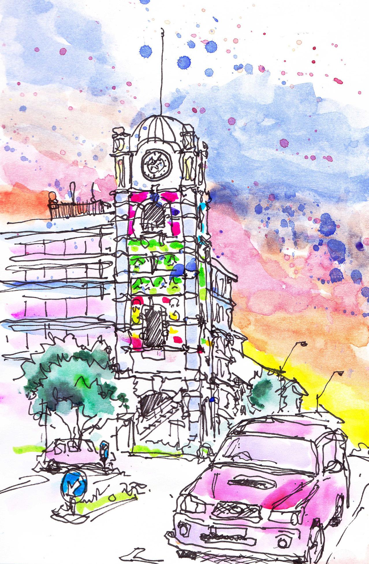 Scott uses an old-fashioned fountain pen, and colours with Tombow pens washed with a water brush. He likens sketching to photography, just a slower shutter speed, and consequently the additional value of remembering every sketch location.