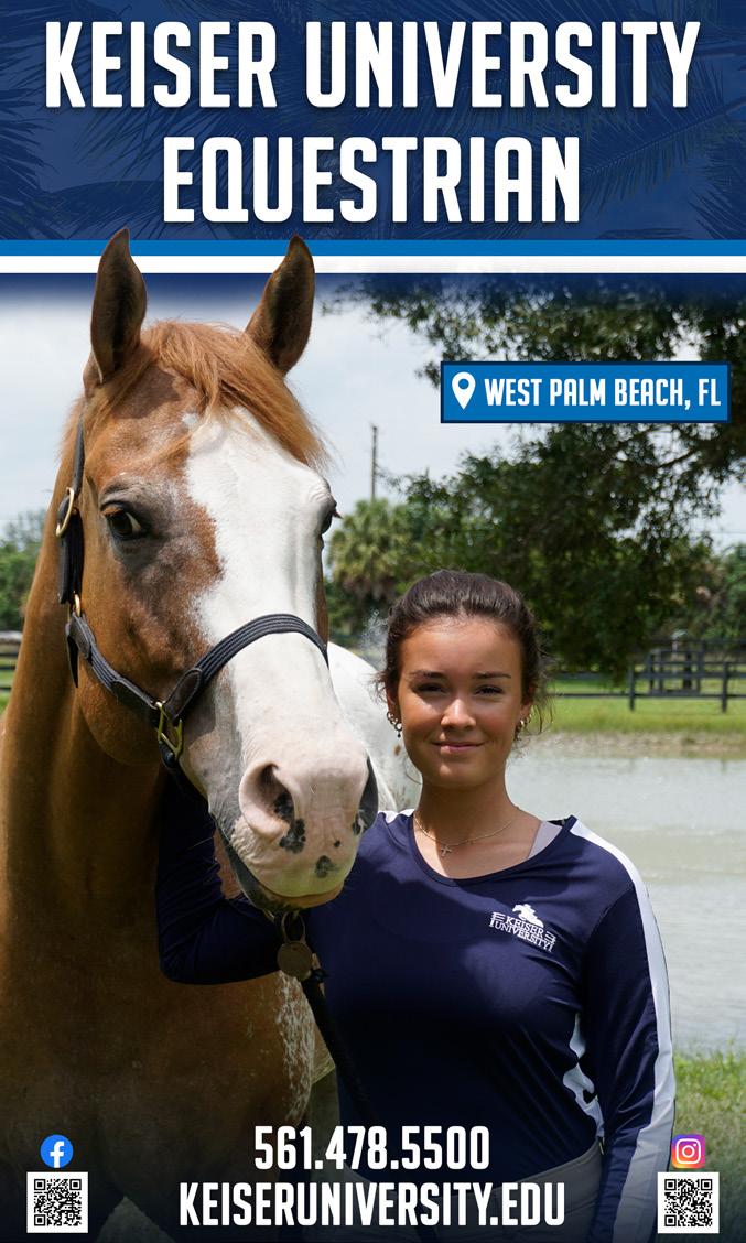 22 // Collegiate Equestrian Handbook GIVE YOUR PASSION A FUTURE. EQUINE STUDIES B.S. MBA Concentrations in: • Management • Rehabilitation • Science • 100% Online • Complete in 12–15 Months • 33-36 Credit Hours 800.952.4122 MIDWAY.EDU/EQUINE Hunt Seat and Western Competitive Teams 200 Acre Working Horse Farm